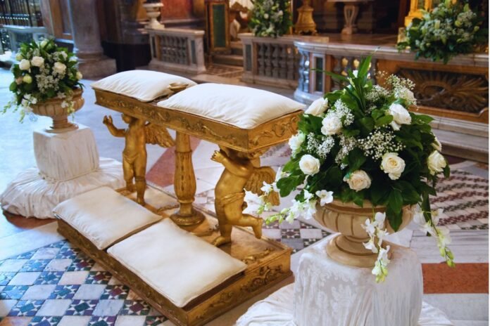 En cuanto a la iglesia, se utilizan para realzar la belleza de este espacio y crear un ambiente acogedor y festivo. Arcos florales en la entrada, arreglos en los bancos, altares y guirnaldas a lo largo de los pasillos son algunas de las opciones para embellecer la ceremonia. La elección del tipo y color puede estar en sintonía con el tema de la boda o resaltar la estética del lugar de manera armoniosa.