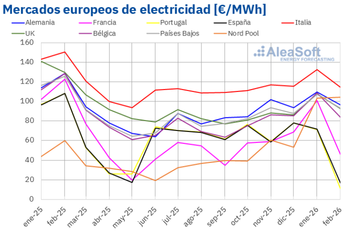 En febrero, los precios de la mayoría de los mercados europeos bajaron. Varios registraron el menor valor de los últimos meses. El mercado portugués alcanzó el precio más bajo de su historia en el mercado ibérico. La caída de precios de gas y CO2, junto con el descenso de la demanda y el aumento de la producción renovable, favoreció esta tendencia. Francia, Italia y Portugal registraron la mayor producción eólica de su historia para un mes de febrero, algo que también ocurrió con la fotovoltaica en Italia