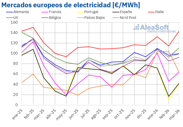 En el primer trimestre de 2026, los precios de la mayoría de los mercados eléctricos europeos aumentaron respecto al trimestre anterior y superaron los 90 €/MWh en la mayoría de los casos. El aumento de los precios del gas y de la demanda impulsó las subidas, mientras que las renovables favorecieron el descenso de los precios en el mercado ibérico. La producción eólica y fotovoltaica marcó récords trimestrales en España e Italia y los futuros de Brent alcanzaron su nivel más alto desde 2024
