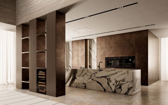Por su parte, en «La Cuisine Bourgogne Dorée» de Inmaculada Recio Studio, el concepto del espacio busca el equilibrio perfecto entre lujo, sobriedad y calidez. Así, los electrodomésticos de esta línea minimalista dialogan con el burdeos, los destellos dorados, el mármol y el nogal. El proyecto rinde homenaje a una elegancia atemporal, en sintonía con el lenguaje estético de la línea MattBlack de Küppersbusch.