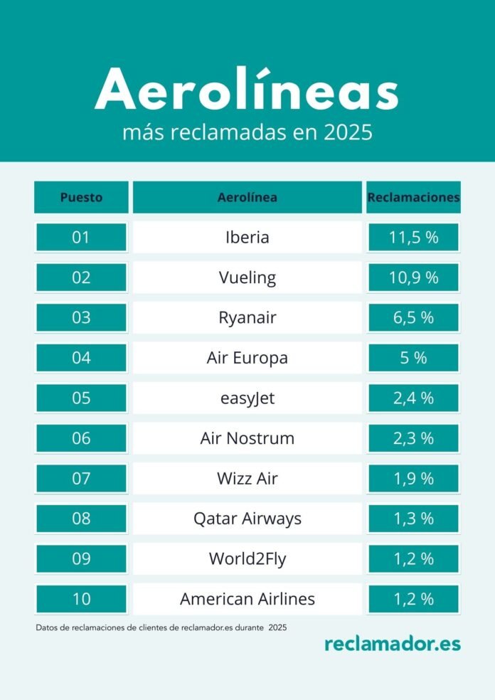 Iberia cerró 2025 como la aerolínea más reclamada por retrasos, cancelaciones de vuelos, overbooking o problemas de equipaje, según datos de reclamador.es, compañía online líder en reclamaciones aéreas. Esto rompe la tendencia de los últimos años, donde Vueling ocupaba desde el 2022 la primera posición de este ranking. El 11,5 % del total de reclamaciones gestionadas el pasado año por reclamador.es fueron frente a Iberia, dato que aumenta hasta casi el 15 % si se contabilizan sus dos filiales, Air Nostrum e Iberia Express.