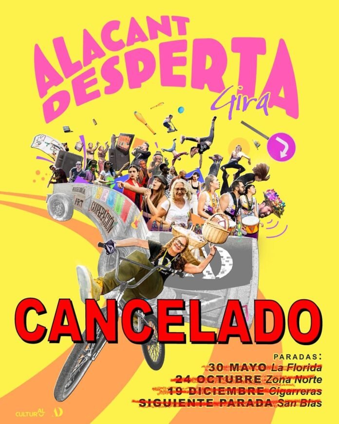 El colectivo cultural Alacant Desperta ha anunciado la cancelación de su proyecto para 2026, denominado «AD Gira», tras no obtener los permisos necesarios para la realización de las actividades previstas en distintos espacios públicos de la ciudad.
