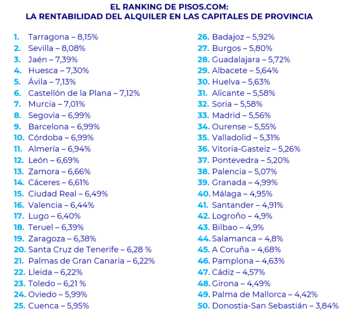 El ranking de pisos.com sobre la rentabilidad media del alquiler de las capitales de provincia españolas dibujó una horquilla que va desde una rentabilidad del 8,15% registrada en Tarragona al 3,84% de Donostia – San Sebastián. En este sentido, los precios más competitivos se encontraron en la ya citada Tarragona (8,15%), Sevilla (8,08%), Jaén (7,39%), Huesca (7,30%), Ávila (7,13%), Castellón de la Plana (7,12%), Murcia (7,01%), Segovia (6,99%), Barcelona (6,99%) y Córdoba (6,99%). En el ranking de rentabilidad de las capitales de provincia menos beneficiosas fueron Donostia – San Sebastián (3,84%), Palma (4,42%), Girona (4,49%), Cádiz (4,57%), Pamplona (4,67%), A Coruña (4,68%), Salamanca (4,80%), Bilbao (4,9%), Logroño (4,9%) y Santander (4,91%). «El mercado del alquiler muestra diferencias muy marcadas entre ciudades, con zonas más rentables y otras donde acceder a una vivienda es cada vez más difícil. La escasez de pisos disponibles y la inseguridad regulatoria generan incertidumbre tanto para propietarios como para inquilinos. Esto refleja que el desafío del alquiler no es solo económico, sino un problema social y estructural que requiere atención», afirma el experto.