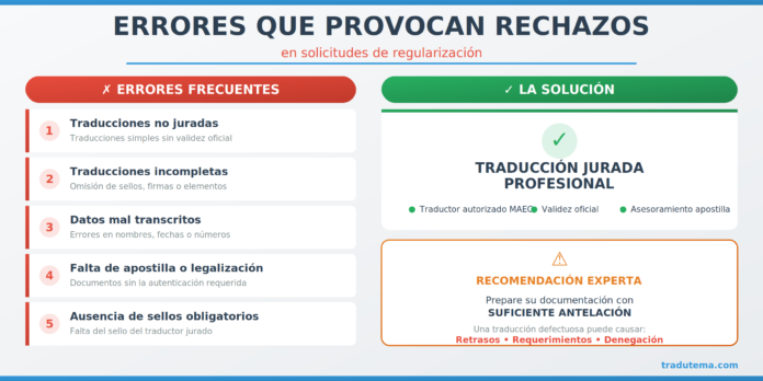 Una traducción no jurada, incompleta o sin apostilla puede provocar el rechazo o archivo de una solicitud de regularización, incluso si se presenta dentro de plazo.