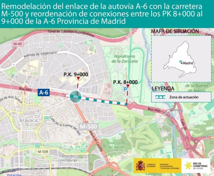 El Ministerio de Transportes y Movilidad Sostenible ha aprobado el expediente de información pública y definitivamente el proyecto de trazado para la remodelación del enlace de la autovía A-6 con la M-500 y la reordenación de las conexiones entre los kilómetros 8 y 9.