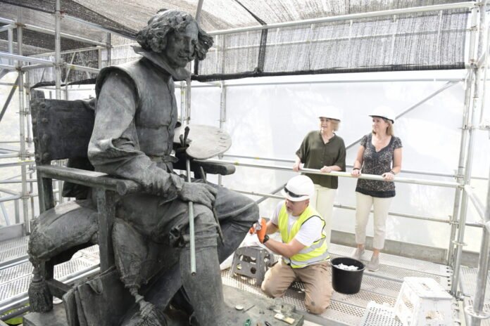 La delegada de Cultura, Turismo y Deporte, Marta Rivera de la Cruz, ha visitado hoy el monumento a Diego Velázquez situado en el paseo del Prado, donde el Ayuntamiento de Madrid está ejecutando una intervención integral de conservación y restauración. Los trabajos, impulsados por la Dirección General de Patrimonio Cultural y Paisaje Urbano, cuentan con un presupuesto de casi 28.000 euros y finalizarán la primera quincena de septiembre.