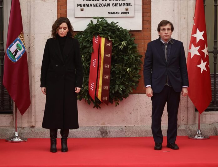 La Comunidad de Madrid y el Ayuntamiento de la capital han recordado este lunes a primera hora de la mañana en la Puerta del Sol a las víctimas del 11 de marzo, el atentado yihadista en el que murieron 193 personas y que dejo más de 2.000 heridos, cuando se cumplen 20 años de la tragedia, poniéndose de su lado y clamando «contra la desmemoria».