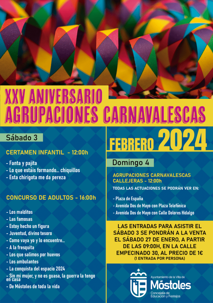 Además, la celebración de la XXVedición del Concurso de Agrupaciones Carnavalescas tendrá lugar el sábado día 3 de febrero, en el Teatro Villa de Móstoles, a partir de las 16:00 horas, y en el que participarán un total de 11 agrupaciones de adultos, interpretando: “Los malditos”, “Las famosas”, “Estoy hecho un figura”, “Juventud divino tesoro”, “Como vaya yo y lo encuentre…”, “A la fresquita”, “Los que salimos por