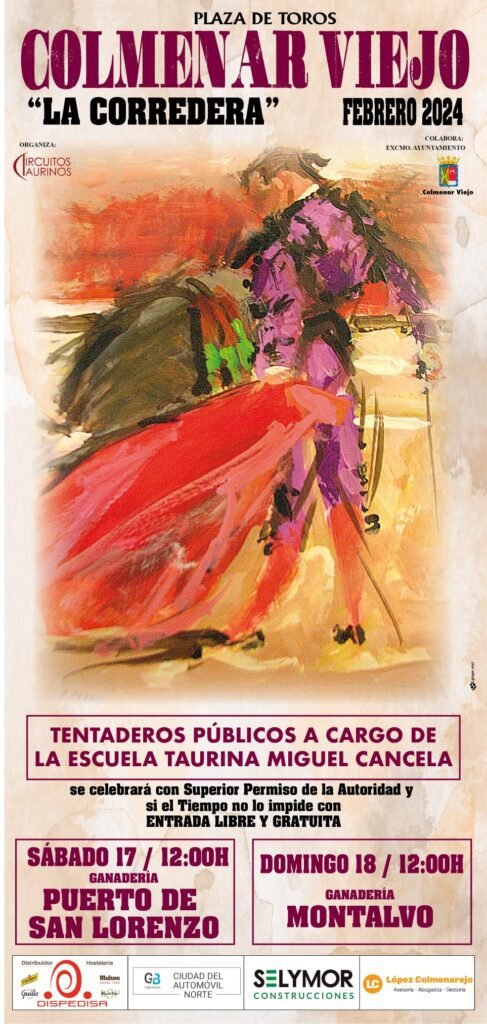 Con el Superior Permiso de la Autoridad y si el Tiempo no lo impide’, el sábado 17 y el domingo 18 de febrero se abrirán, a las doce del mediodía, las puertas del coso de la Plaza de Toros ‘La Corredera’ de Colmenar Viejo para dar paso a la realización de dos Tentaderos Públicos que contarán con los alumnos de la Escuela Taurina Miguel Cancela.
