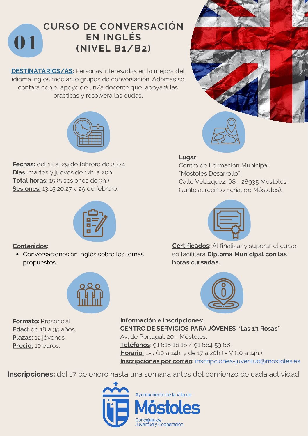 Desde la próxima semana el idioma de Shakespeare será el principal protagonista en las clases del curso “Conversación en inglés (nivel B1/B2)”, que ofrece el Ayuntamiento de Móstoles, a través de la Concejalía de Juventud y Cooperación, para fomentar la empleabilidad y potenciar el desarrollo profesional de los jóvenes.