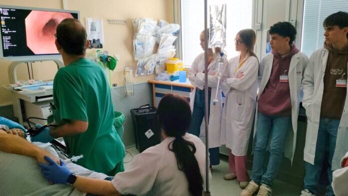 Igualmente, varios alumnos han podido ver la intervención con endoscopia a pacientes en Aparato Digestivo, con ayuda del jefe del Servicio, José Luis Urda y la facultativa, María Delgado.