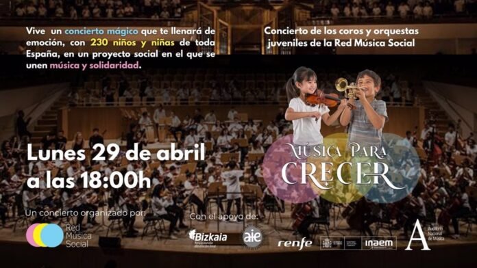 El Auditorio Nacional de Música de Madrid acogerá el concierto «Música para Crecer» interpretado por 230 niños de toda España el próximo lunes 29 de abril a las 18h, una actuación a través de las ocho entidades sociales que conforman la Red Música Social (RMS), y en la que se expresará a través de la melodía el compromiso con la interculturalidad, la equidad y la inclusión.